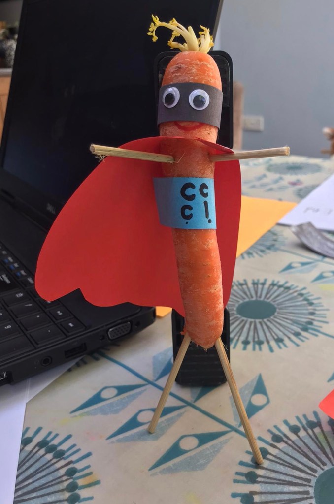 Look closely to see how Harriet has made her superhero. She chose a good carrot, already curved for a quick take-off into the sky. She left the little sprouting leaves at the top to make his stylish hairdo. She has drawn his smiling mouth and made his cape from red paper. Harriet was lucky to have some googly eyes at home to peep out from his black mask and she has given Colin stick arms and legs.
