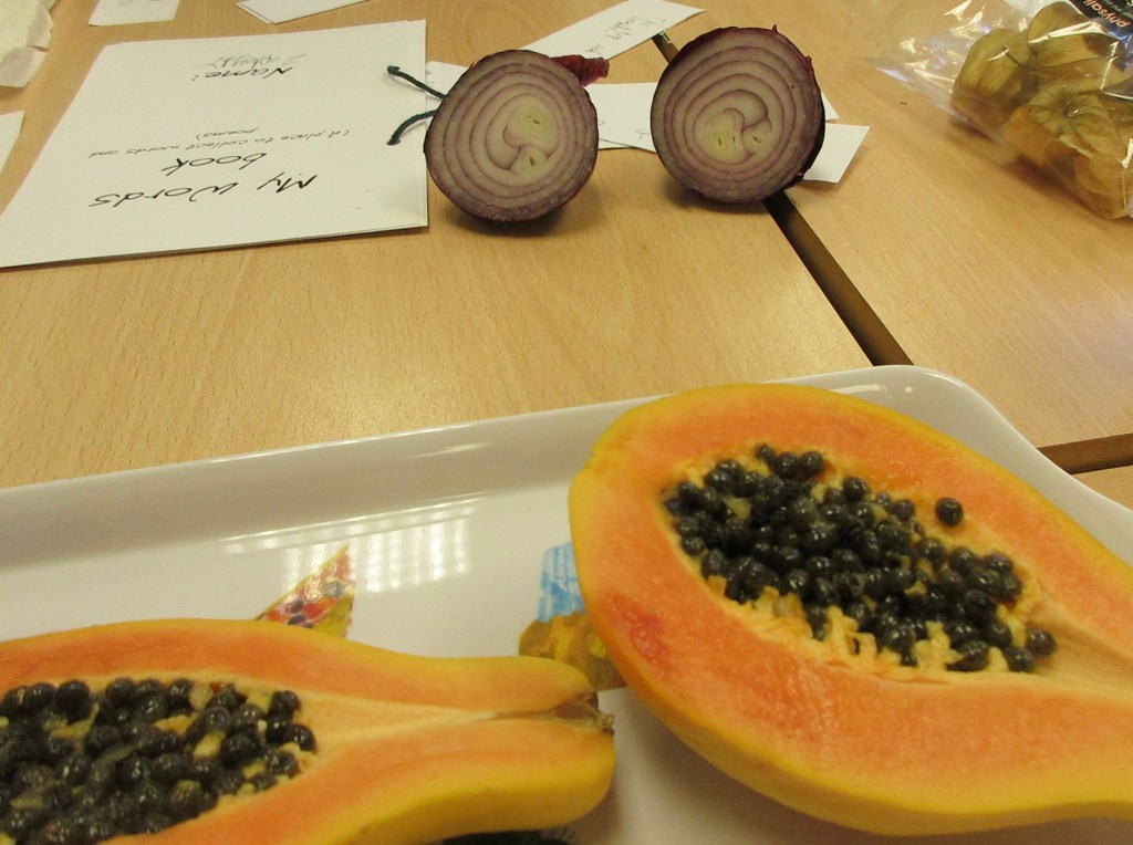 Here’s a way of looking closely and writing poems, as a group, in pairs or alone. We were prompted to write about it now, because pumpkins are such a good subject for this approach. However, there are all kinds of fruit and vegetables which work well.