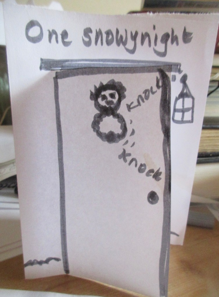 Fold a sheet of A4 or A5 paper in half to make a card. Cut a door from the front sheet. On the outside, draw the details of the door and a few words of introduction. On the inside you can draw the person who answers the knock or the person who is outside knocking. Use the back of the door flap to write what happens, or what is said.